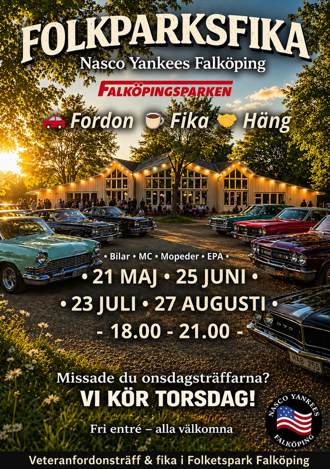Ett mysigt samarbete ihop Med Nasco Yankees Falköing, som vi ser massor fram emot! Ta med dig en kompis och kom rullande i stil eller ta cykeln, fika och titta på bilarna, så ses vi i Falköpingsparken! Fri entré och alla är välkomna!